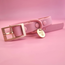 Hand wash our collars in warm soapy water and lay flat to dry. Do not put them in the washing machine. Be mindful that water can harsh on hard wear, so dry quickly after washing. Blush pink paint on D-ring can scratch so take care when using.